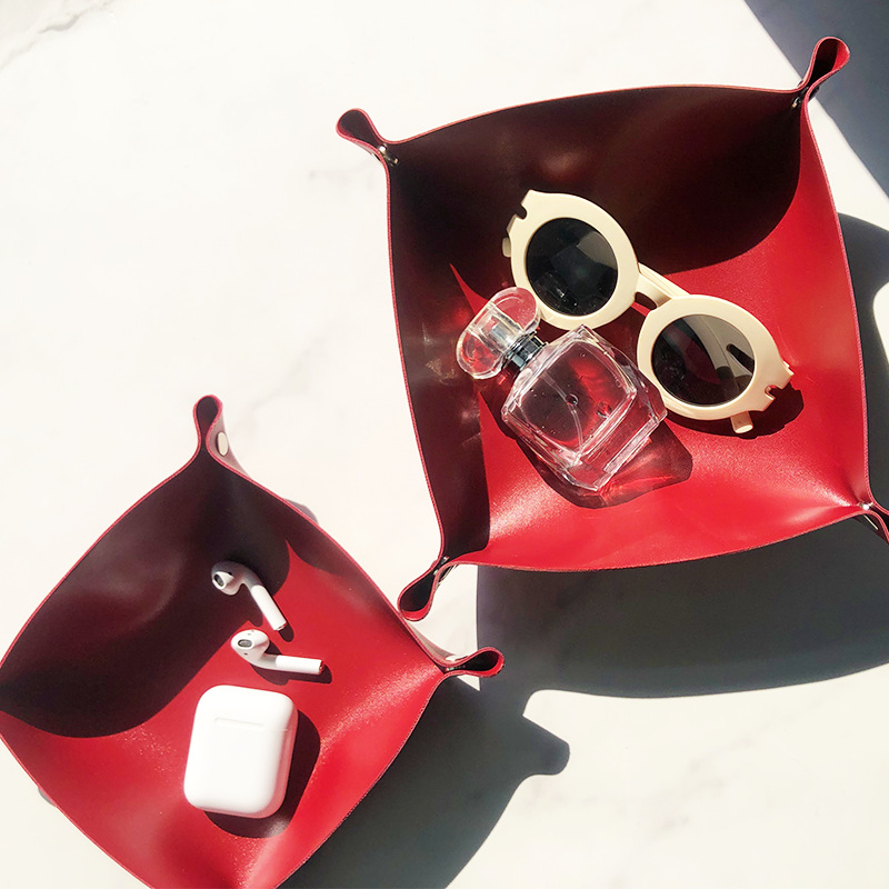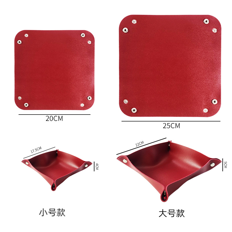 Here is the introduction to PU desktop storage trays: With a good appearance texture: PU material can imitate the texture and of genuine leather, with a soft, smooth surface, which can add a sense of delicacy and class to the desktop. Waterproof and easy to clean: It has good performance, stains are not easy to penetrate, and it can remain clean with a damp cloth wipe, making it easy to manage. High flexibility: The texture is flexible, not to crack or deform, and can withstand a certain degree of squeezing and bending, which can adapt to the placement of different items. Various styles: Rich in color, can made into various colors through dyeing technology; the shape is changeable, with simple squares, circles, irregular shapes, etc., and can also add decorative elements such as buttons zippers, etc. Avoid direct sunlight: Long-term exposure to the sun will cause the PU material to age, fade, harden, and become brittle, and should placed in a cool, ventilated place indoors. - Prevent sharp objects from scratching: Sharp items are prone to leave scratches on the surface, affecting the appearance and service life and caution should be exercised when placing and retrieving items. - Regular cleaning: Regularly wipe with a clean damp cloth to remove dust and stains; if there are stubborn stains, you can use a mild cleaner diluted and wiped, then rinsed with clean water and dried. - Pay attention to the storage environment: Avoid placing in a humid environment prevent mildew; when not in use, it can be folded or placed flat, placed in a dry, ventilated place, and prevent compression deformation. - Size: Choose to the desktop space and storage needs, such as choosing a small size with more compartments for cosmetics storage, and choosing a large size with large capacity for miscellaneous storage.- Structure design: Consider the internal structure, such as whether there are compartments, layers, whether the compartment size is appropriate, and whether it can be folded, disassembled etc., to meet the needs of classified